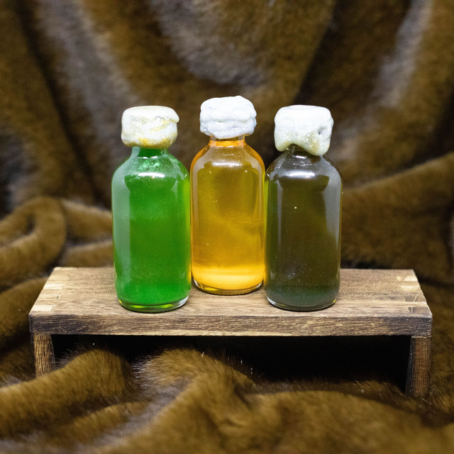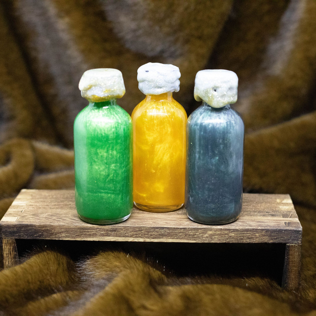 Scellées à jamais, ces trois fioles mystiques 🌿💛🌌 renferment des éclats d’énergies anciennes.